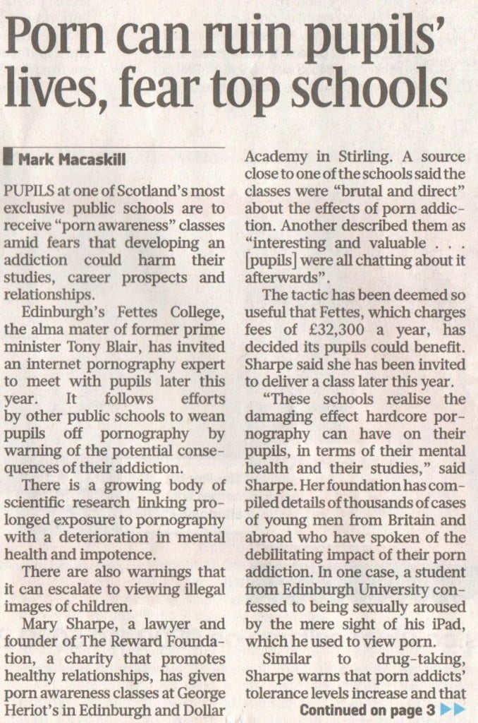 Mary Sharpe, a lawyer and founder of The Reward Foundation, a charity that promotes healthy relationships, has already given porn awareness classes at George Heriot’s and Dollar Academy in Stirling.